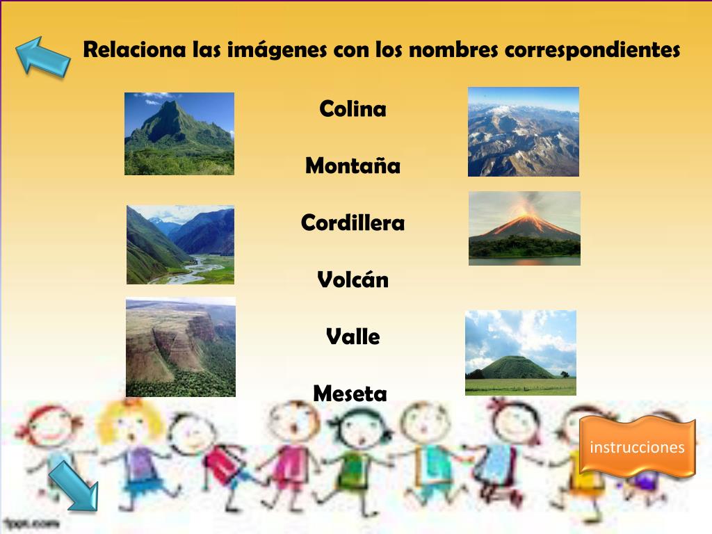 Relaciona las imágenes con los nombres correspondientes Colina Montaña Cordillera Volcán Valle Meseta instrucciones