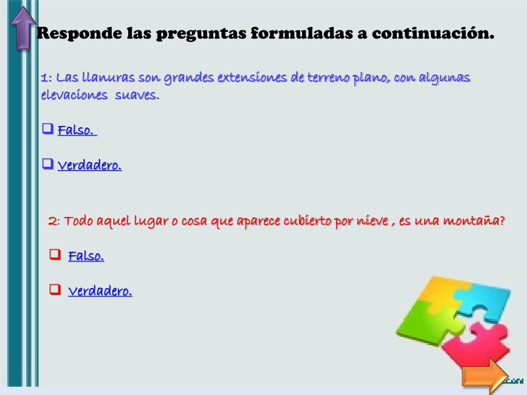 Responde las preguntas formuladas a continuación. • 1: Las llanuras son grandes extensiones de terreno plano, con algunas • elevaciones suaves. • Falso. • Verdadero. • 2: Todo aquel lugar o cosa que aparece cubierto por nieve, es una montaña? • Falso. • Verdadero.