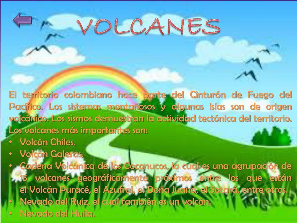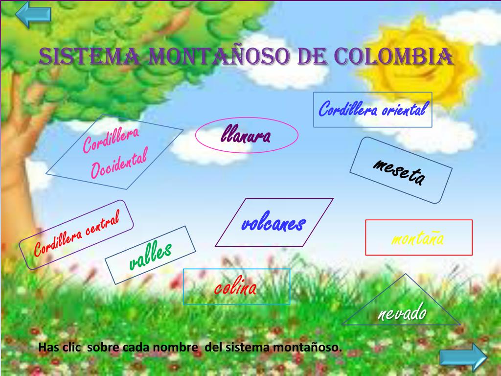 Sistema montañoso de Colombia Cordillera oriental Cordillera Occidental llanura meseta volcanes Cordillera central montaña valles colina nevado Has clic sobre cada nombre del sistema montañoso.