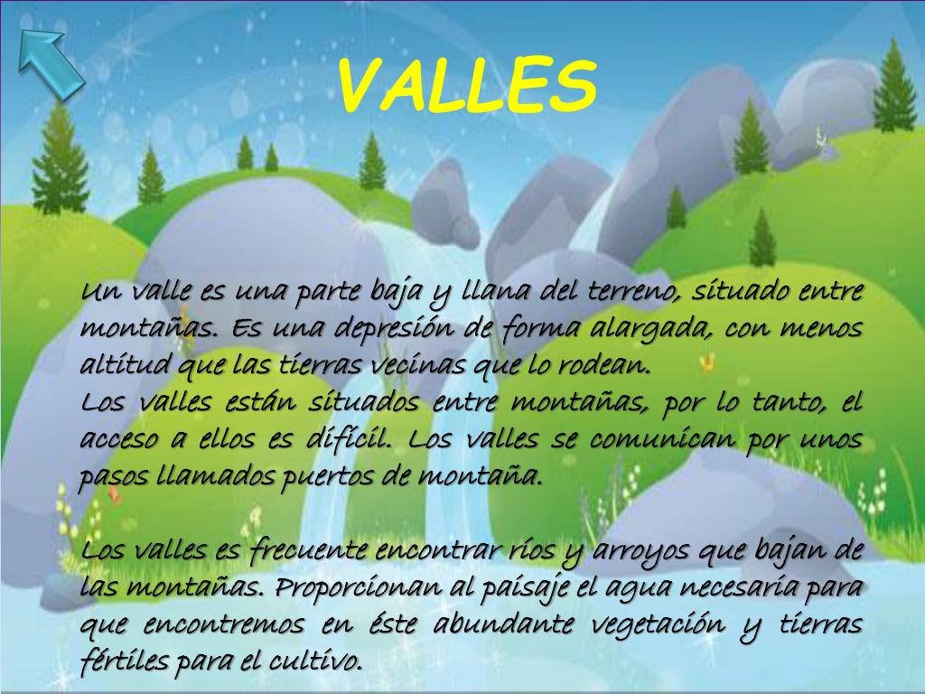 VALLES • Un valle es una parte baja y llana del terreno, situado entre montañas. Es una depresión de forma alargada, con menos altitud que las tierras vecinas que lo rodean. • Los valles están situados entre montañas, por lo tanto, el acceso a ellos es difícil. Los valles se comunican por unos pasos llamados puertos de montaña. • Los valles es frecuente encontrar ríos y arroyos que bajan de las montañas. Proporcionan al paisaje el agua necesaria para que encontremos en éste abundante vegetación y tierras fértiles para el cultivo.