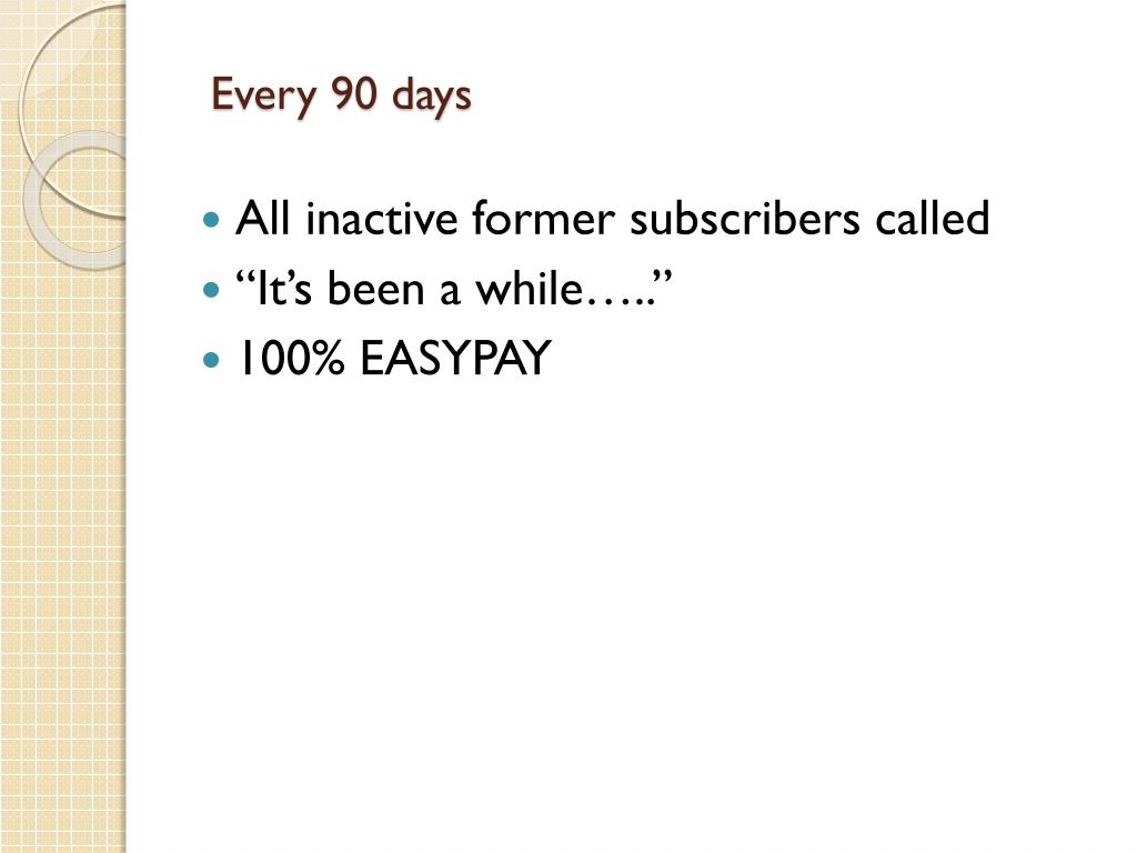 Every 90 days • All inactive former subscribers called • “It’s been a while…..” • 100% EASYPAY