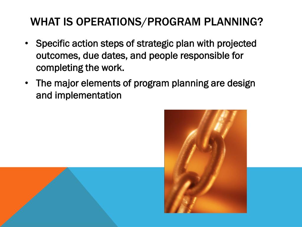 What is operations/program planning? • Specific action steps of strategic plan with projected outcomes, due dates, and people responsible for completing the work. • The major elements of program planning are design and implementation