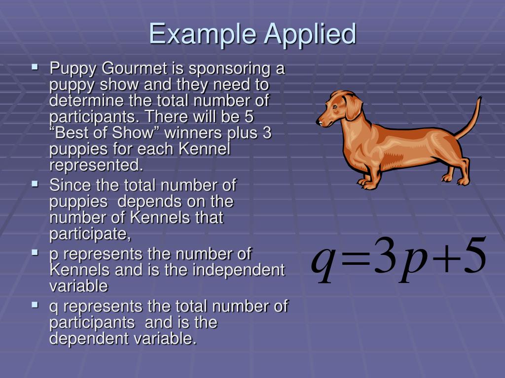 Example Applied • Puppy Gourmet is sponsoring a puppy show and they need to determine the total number of participants. There will be 5 “Best of Show” winners plus 3 puppies for each Kennel represented. • Since the total number of puppies depends on the number of Kennels that participate, • p represents the number of Kennels and is the independent variable • q represents the total number of participants and is the dependent variable.