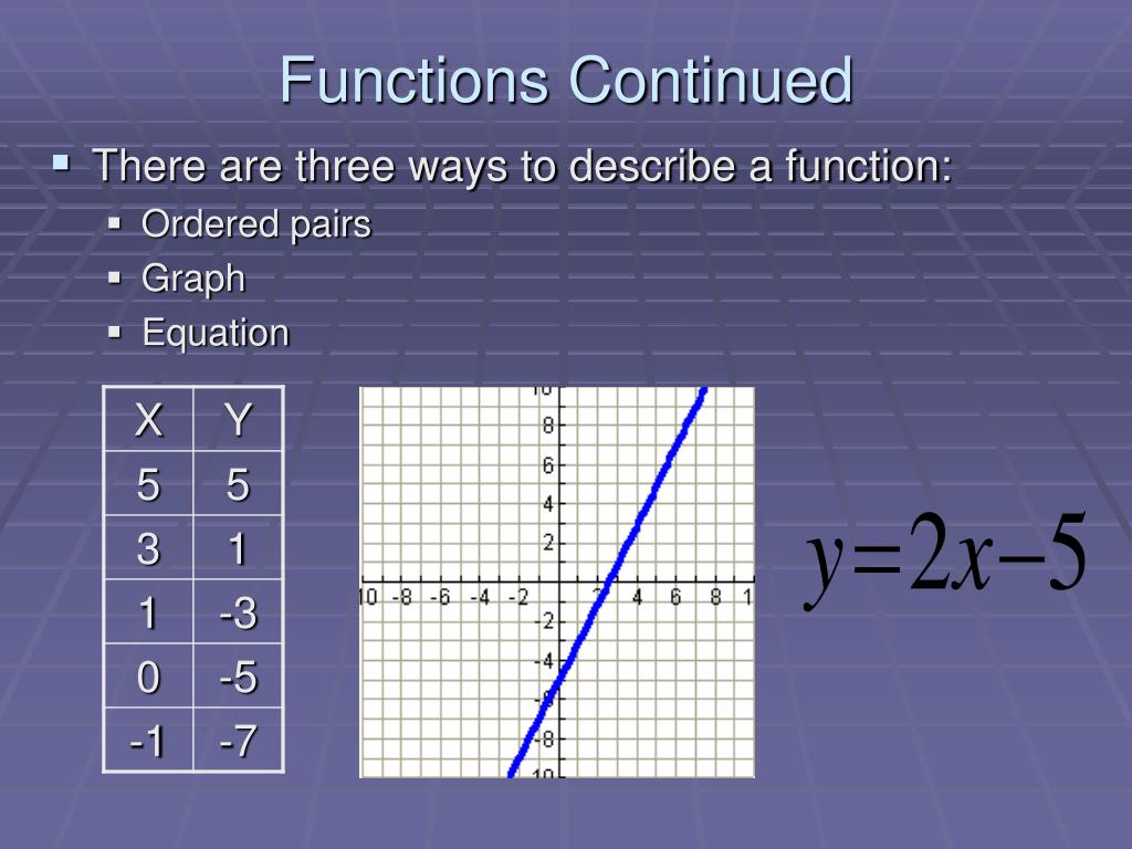 Functions Continued • There are three ways to describe a function: • Ordered pairs • Graph • Equation