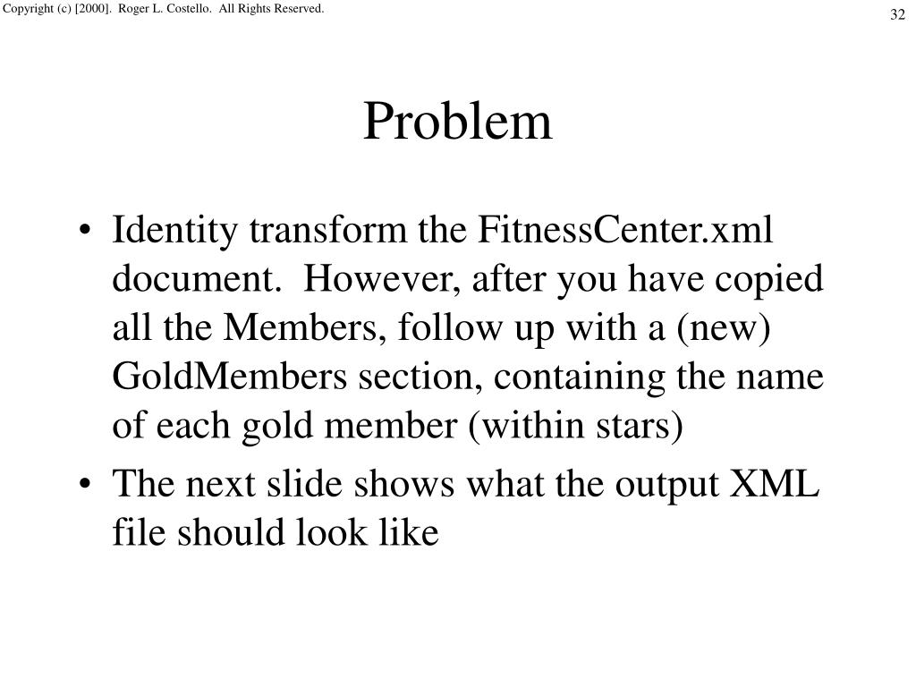 Problem • Identity transform the FitnessCenter.xml document. However, after you have copied all the Members, follow up with a (new) GoldMembers section, containing the name of each gold member (within stars) • The next slide shows what the output XML file should look like