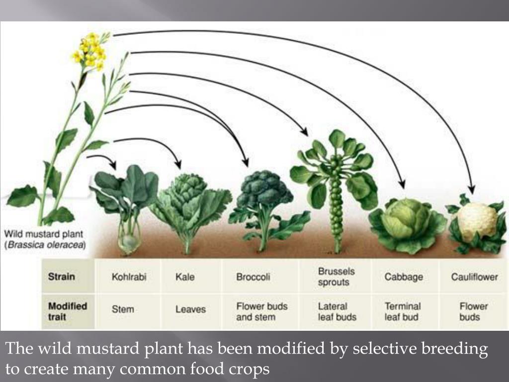 What do the following have in common: • Kohlrabi • Kale • Broccoli • Brussels sprouts’ • Cabbage • Cauliflower The wild mustard plant has been modified by selective breeding to create many common food crops