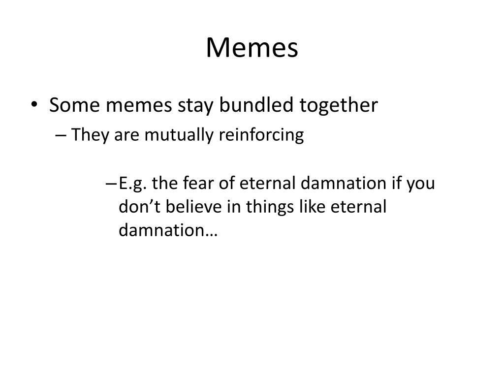 Memes • Some memes stay bundled together • They are mutually reinforcing • E.g. the fear of eternal damnation if you don’t believe in things like eternal damnation…