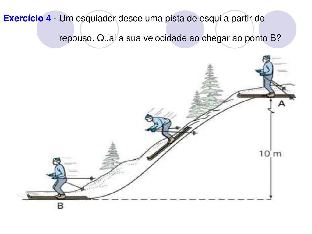 Exercício 4 - Um esquiador desce uma pista de esqui a partir do repouso. Qual a sua velocidade ao chegar ao ponto B?