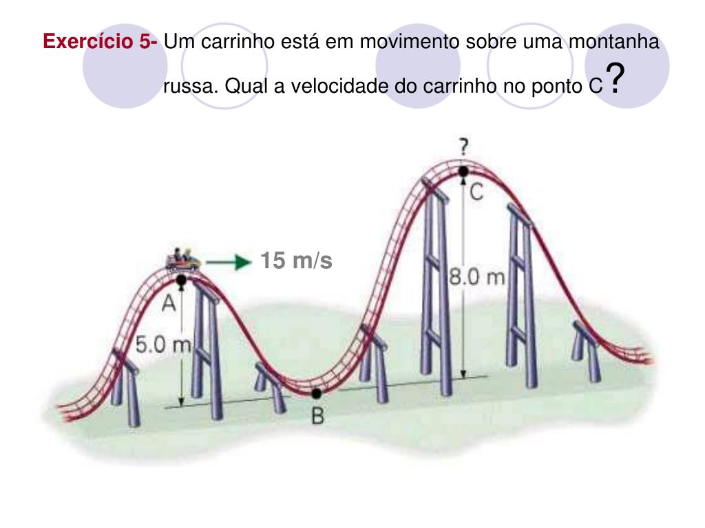 15 m/s Exercício 5- Um carrinho está em movimento sobre uma montanha russa. Qual a velocidade do carrinho no ponto C?