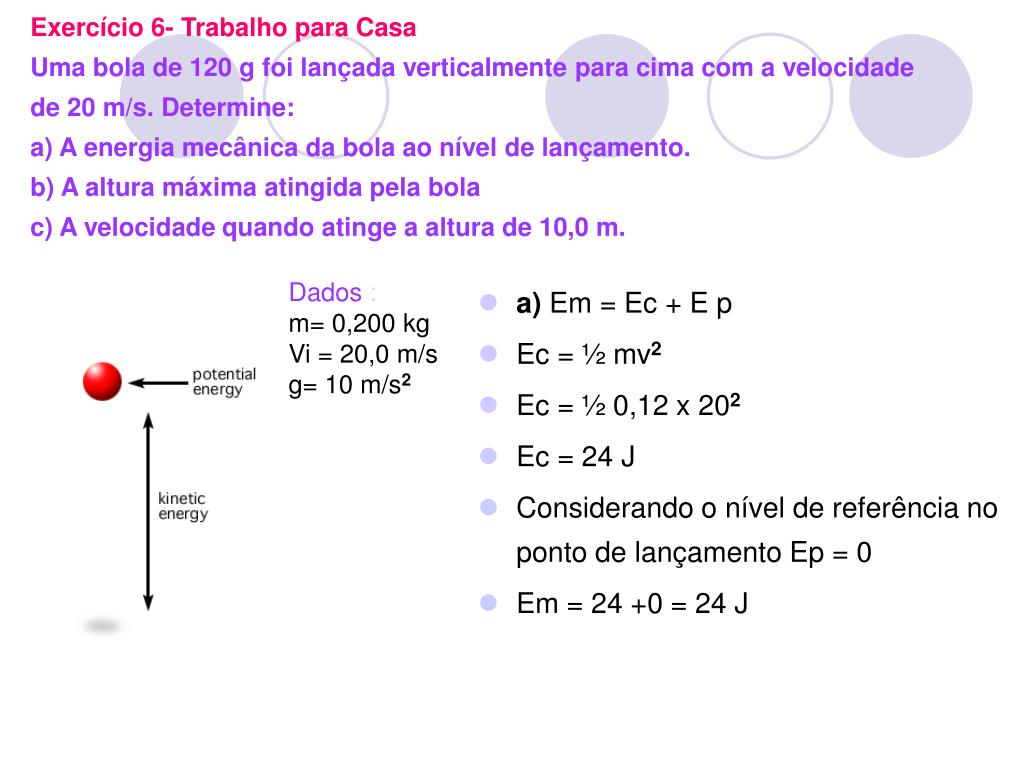 Exercício 6- Trabalho para CasaUma bola de 120 g foi lançada verticalmente para cima com a velocidade de 20 m/s. Determine:a) A energia mecânica da bola ao nível de lançamento.b) A altura máxima atingida pela bolac) A velocidadequando atinge a altura de 10,0 m. • a) Em = Ec + E p • Ec = ½ mv2 • Ec = ½ 0,12 x 202 • Ec = 24 J • Considerando o nível de referência no ponto de lançamento Ep = 0 • Em = 24 +0 = 24 J Dados : m= 0,200 kg Vi = 20,0 m/s g= 10 m/s2
