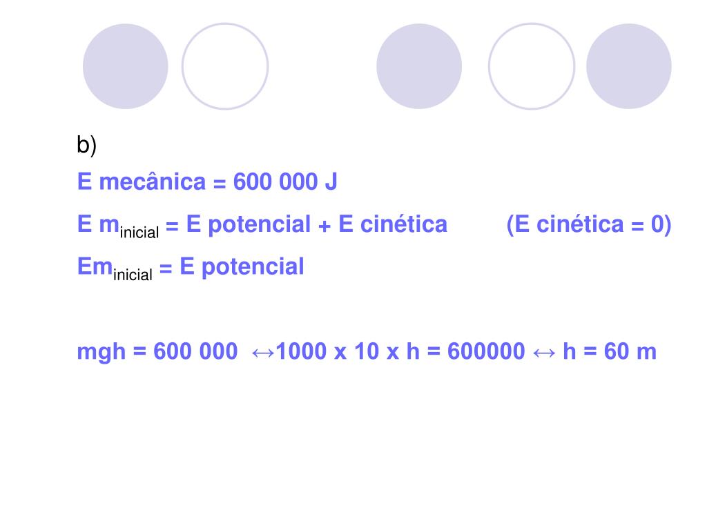 b) E mecânica = 600 000 J E minicial = E potencial + E cinética (E cinética = 0) Eminicial = E potencial mgh = 600 000 ↔1000 x 10 x h = 600000 ↔ h = 60 m