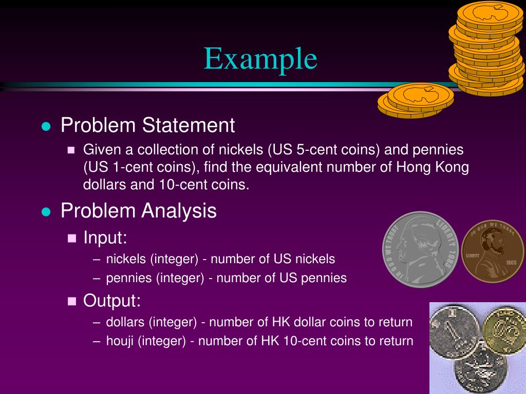 Example • Problem Statement • Given a collection of nickels (US 5-cent coins) and pennies (US 1-cent coins), find the equivalent number of Hong Kong dollars and 10-cent coins. • Problem Analysis • Input: • nickels (integer) - number of US nickels • pennies (integer) - number of US pennies • Output: • dollars (integer) - number of HK dollar coins to return • houji (integer) - number of HK 10-cent coins to return