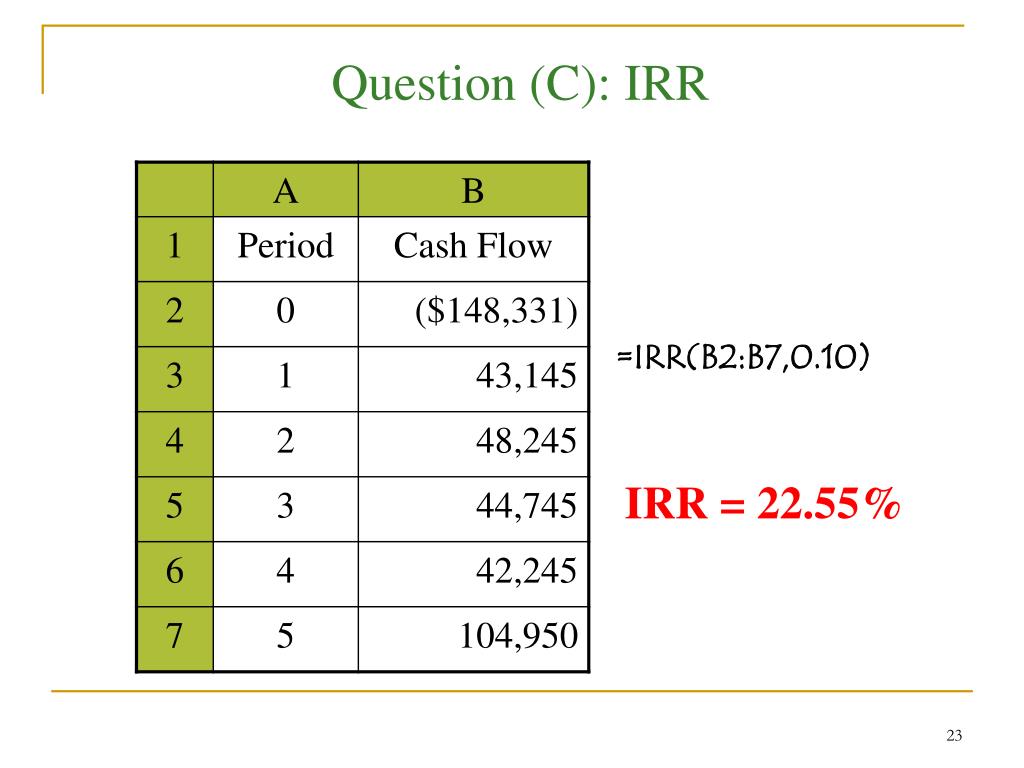 Question (C): IRR =IRR(B2:B7,0.10) IRR = 22.55%