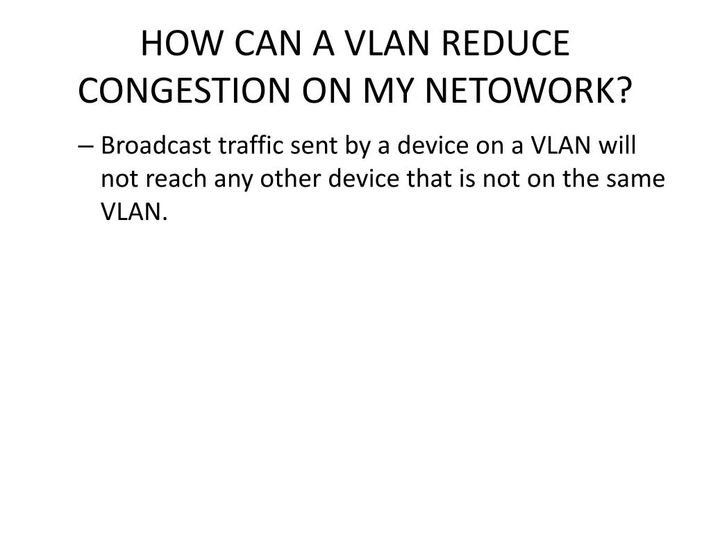 HOW CAN A VLAN REDUCE CONGESTION ON MY NETOWORK? • Broadcast traffic sent by a device on a VLAN will not reach any other device that is not on the same VLAN.