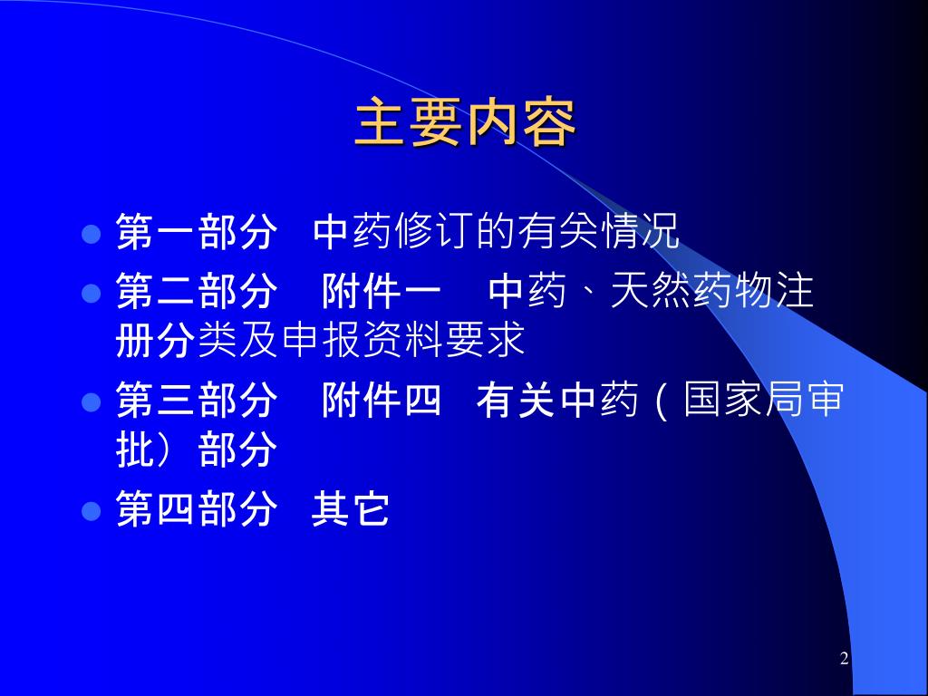 主要内容 • 第一部分 中药修订的有关情况 • 第二部分 附件一 中药、天然药物注 册分类及申报资料要求 • 第三部分 附件四 有关中药(国家局审批)部分 • 第四部分 其它