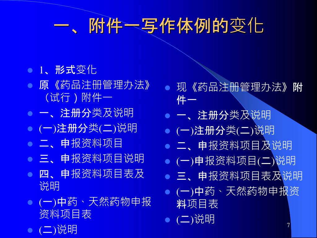 一、附件一写作体例的变化 • 1、形式变化 • 原《药品注册管理办法》(试行)附件一 • 一、注册分类及说明 • (一)注册分类(二)说明 • 二、申报资料项目 • 三、申报资料项目说明 • 四、申报资料项目表及说明 • (一)中药、天然药物申报资料项目表 • (二)说明 • 现《药品注册管理办法》附件一 • 一、注册分类及说明 • (一)注册分类(二)说明 • 二、申报资料项目及说明 • (一)申报资料项目(二)说明 • 三、申报资料项目表及说明 • (一)中药、天然药物申报资料项目表 • (二)说明