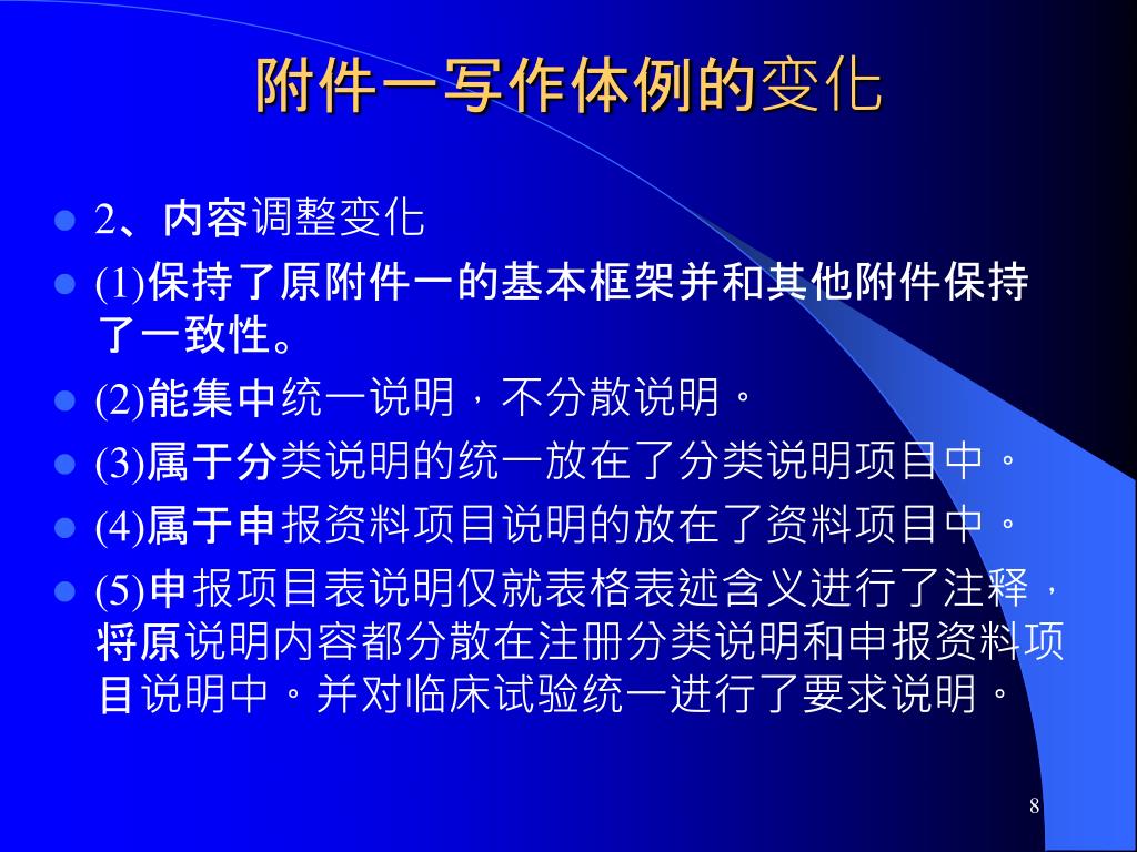 附件一写作体例的变化 • 2、内容调整变化 • (1)保持了原附件一的基本框架并和其他附件保持了一致性。 • (2)能集中统一说明,不分散说明。 • (3)属于分类说明的统一放在了分类说明项目中。 • (4)属于申报资料项目说明的放在了资料项目中。 • (5)申报项目表说明仅就表格表述含义进行了注释,将原说明内容都分散在注册分类说明和申报资料项目说明中。并对临床试验统一进行了要求说明。