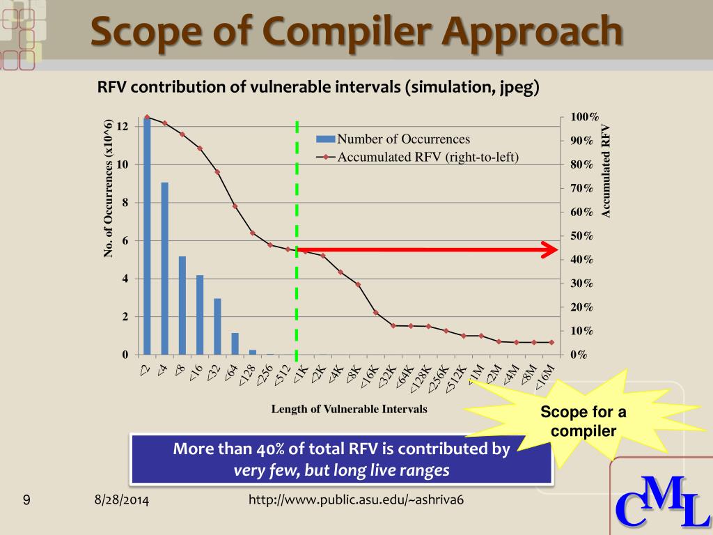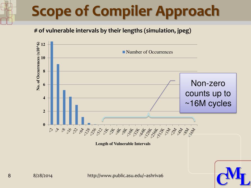 Scope of Compiler Approach # of vulnerable intervals by their lengths (simulation, jpeg) Non-zero counts up to ~16M cycles http://www.public.asu.edu/~ashriva6