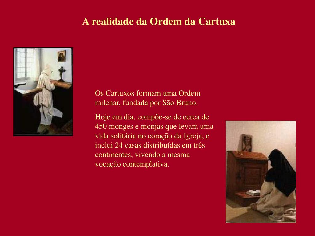 A realidade da Ordem da Cartuxa Os Cartuxos formam uma Ordem milenar, fundada por São Bruno. Hoje em dia, compõe-se de cerca de 450 monges e monjas que levam uma vida solitária no coração da Igreja, e inclui 24 casas distribuídas em três continentes, vivendo a mesma vocação contemplativa.
