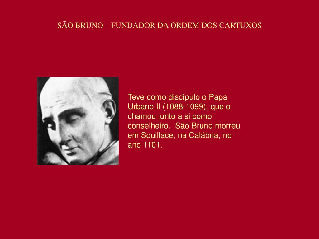 SÃO BRUNO – FUNDADOR DA ORDEM DOS CARTUXOS Teve como discípulo o Papa Urbano II (1088-1099), que o chamou junto a si como conselheiro. São Bruno morreu em Squillace, na Calábria, no ano 1101.