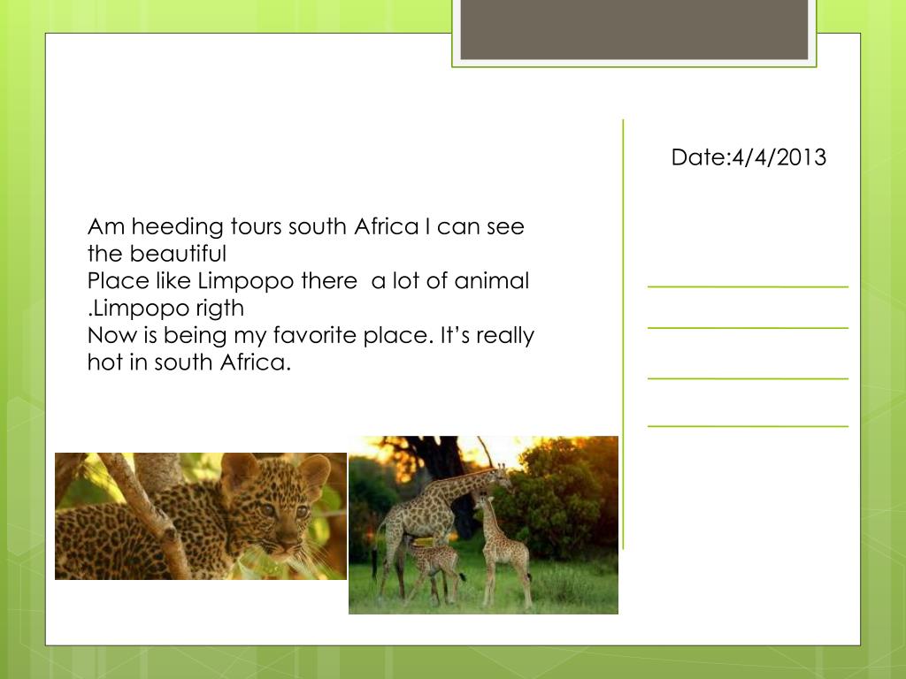 SOUTH AFRICA . Date:4/4/2013 . Am heeding tours south Africa I can see the beautiful Place like Limpopo there a lot of animal .Limpopo rigth Now is being my favorite place. It’s really hot in south Africa. . Geography.