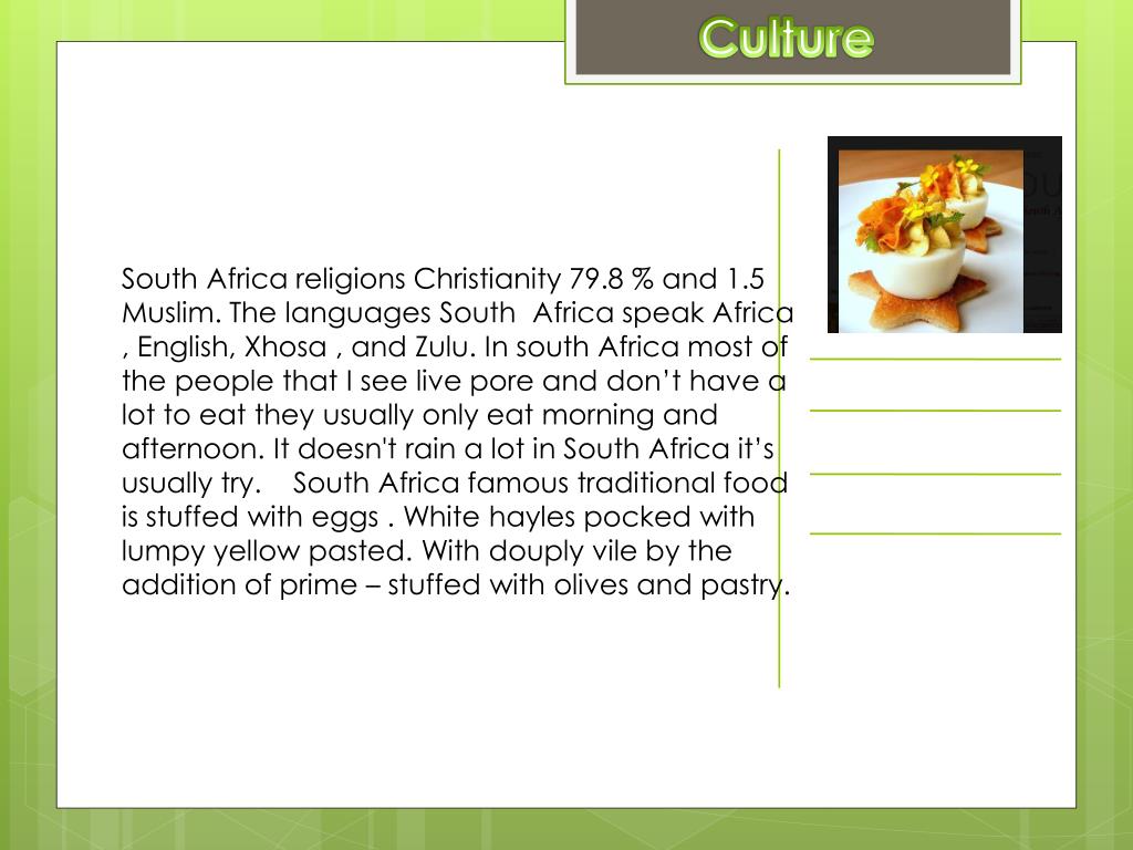 Culture South Africa religions Christianity 79.8 % and 1.5 Muslim. The languages South Africa speak Africa , English, Xhosa , and Zulu. In south Africa most of the people that I see live pore and don’t have a lot to eat they usually only eat morning and afternoon. It doesn't rain a lot in South Africa it’s usually try. South Africa famous traditional food is stuffed with eggs . White hayles pocked with lumpy yellow pasted. With douply vile by the addition of prime – stuffed with olives and pastry.