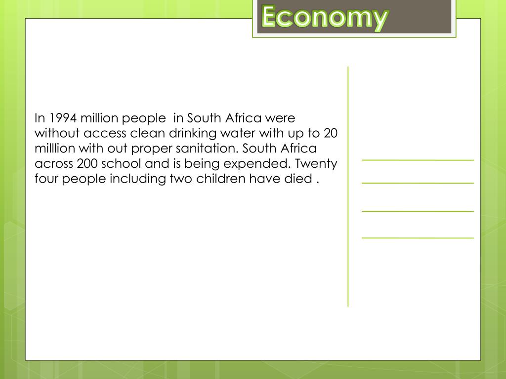 Economy In 1994 million people in South Africa were without access clean drinking water with up to 20 milllion with out proper sanitation. South Africa across 200 school and is being expended. Twenty four people including two children have died .
