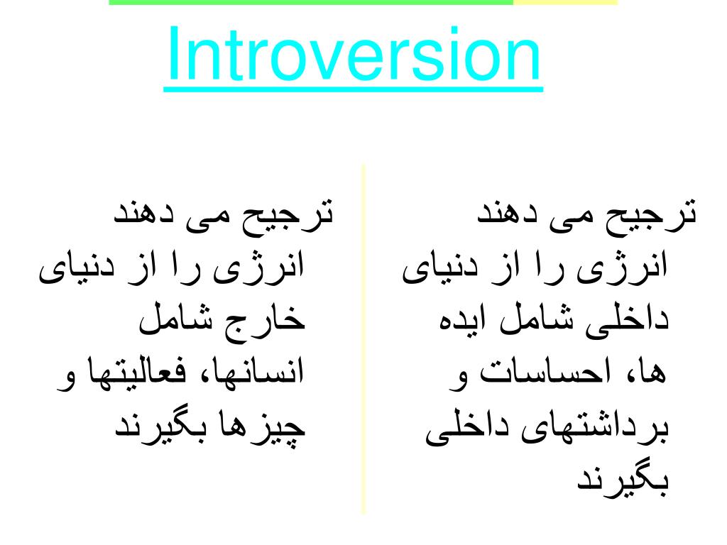 Extraversion or Introversion جهت گيری در مورد انرژیِ ترجيح می دهند انرژی را از دنيای خارج شامل انسانها، فعاليتها و چيزها بگيرند ترجيح می دهند انرژی را از دنيای داخلی شامل ايده ها، احساسات و برداشتهای داخلی بگيرند
