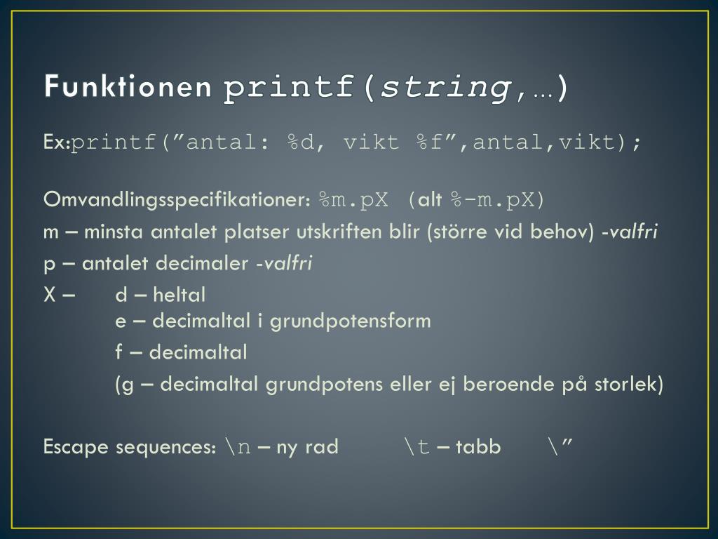 Funktionen printf(string,…) Ex:printf(”antal: %d, vikt %f”,antal,vikt); Omvandlingsspecifikationer: %m.pX (alt %-m.pX) m – minsta antalet platser utskriften blir (större vid behov) -valfri p – antalet decimaler -valfri X – d – heltal e – decimaltal i grundpotensform f – decimaltal (g – decimaltal grundpotens eller ej beroende på storlek) Escapesequences: \n– ny rad \t – tabb\”