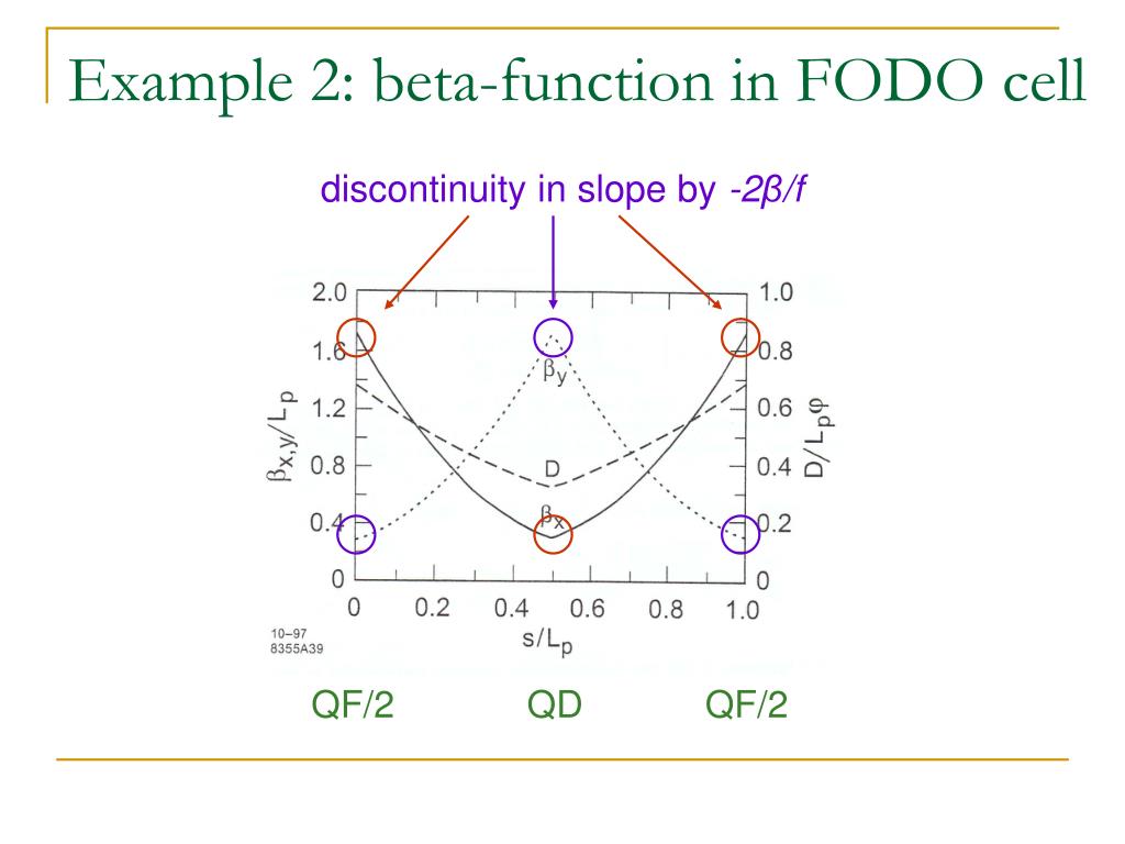 Example 2: beta-function in FODO cell discontinuity in slope by -2β/f QF/2 QD QF/2