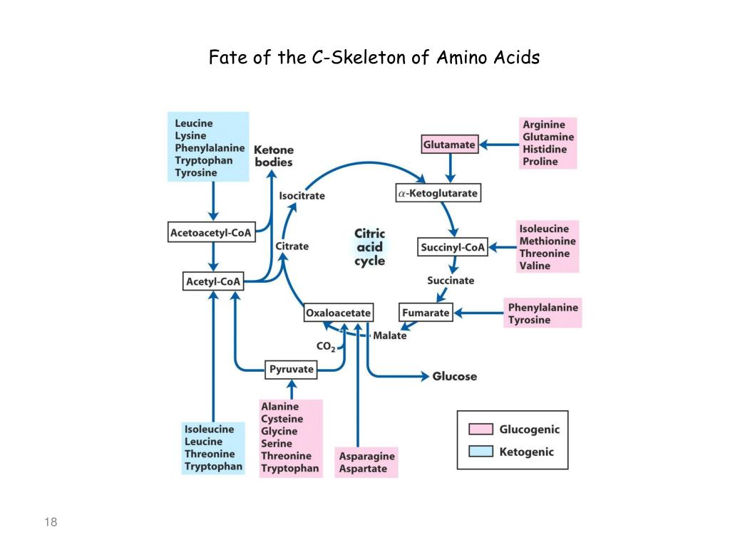 Glucogenic Pyruvate – a-Ketoglutarate Succinyl-CoA Fumarate Oxaloacetate Ketogenic Acetyl-CoA Acetoacetate Products of Amino Acid Breakdown