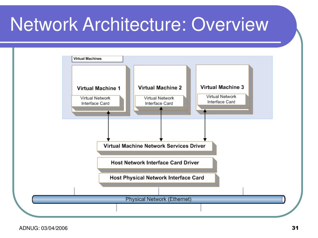 Network Architecture: Details • Virtual network options: • Guest-only • Host Network • Guest-to-host only (through Microsoft Loopback Adapter) • Network Adapters • All Ethernet NIC types are supported • The Virtual Machine Networking Service must be enabled for Virtual Server to use the adapter • Each VM can have up to four virtual NICs • A dedicated NIC can be used for Virtual Server • Only the Virtual Machine Networking Service must be bound • More Features • Virtual DHCP Server for each virtual network • Integration with Internet Connection Firewall (ICF) and Internet Connection Sharing (ICS)