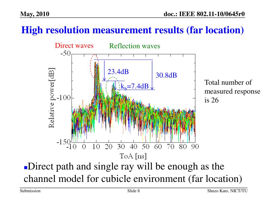 High resolution measurement results (far location) Direct waves Reflection waves 23.4dB 30.8dB Total number of measured response is 26 kb=7.4dB • Direct path and single ray will be enough as the channel model for cubicle environment (far location) Shuzo Kato, NICT/TU