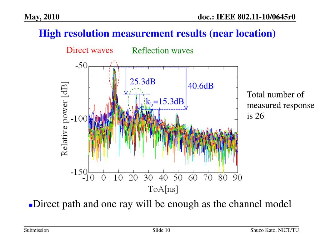 High resolution measurement results (near location) Direct waves Reflection waves 25.3dB 40.6dB Total number of measured response is 26 kb=15.3dB • Direct path and one ray will be enough as the channel model Shuzo Kato, NICT/TU