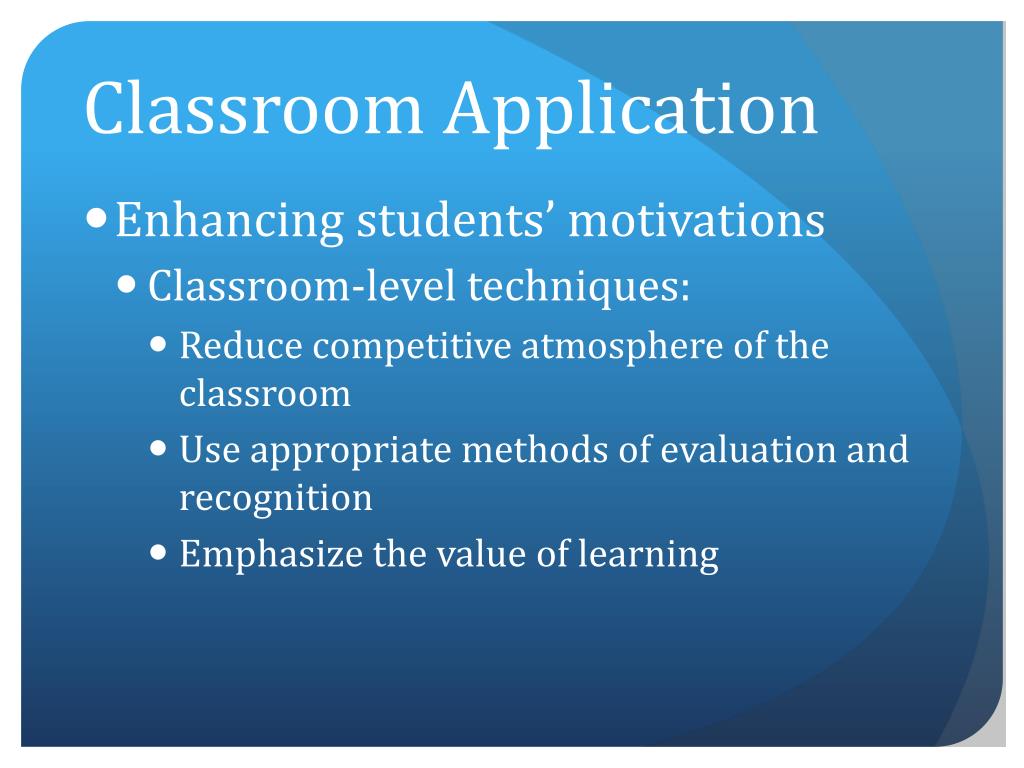 Classroom Application • Enhancing students’ motivations • Classroom-level techniques: • Reduce competitive atmosphere of the classroom • Use appropriate methods of evaluation and recognition • Emphasize the value of learning