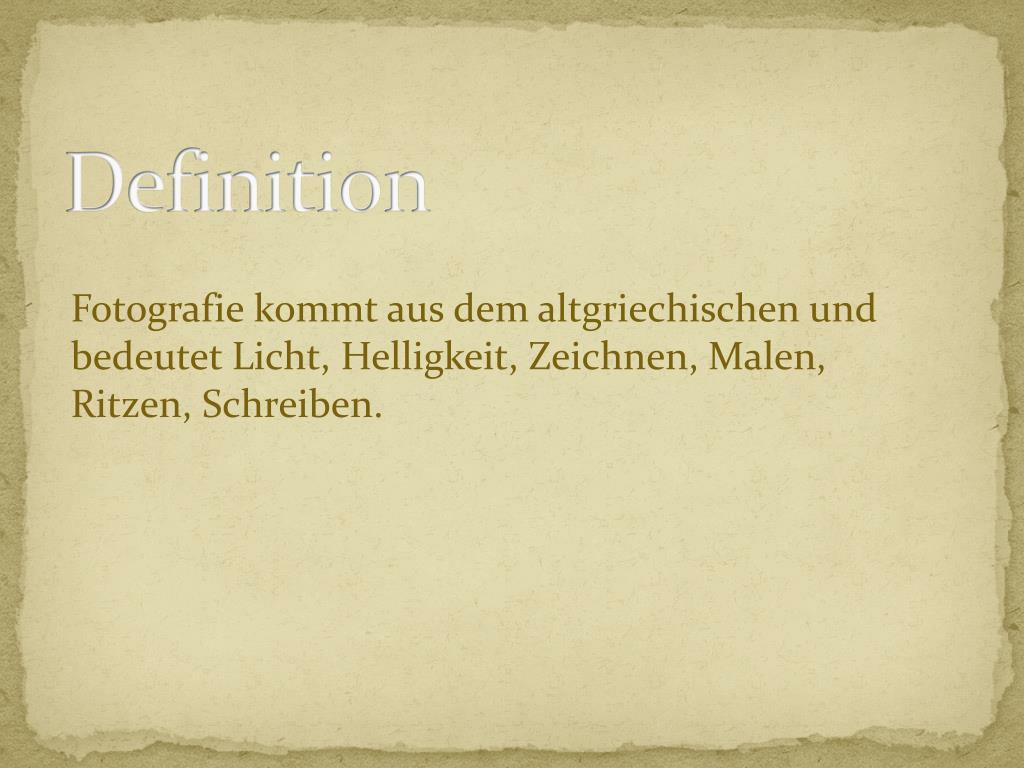 Definition Fotografie kommt aus dem altgriechischen und bedeutet Licht, Helligkeit, Zeichnen, Malen, Ritzen, Schreiben.