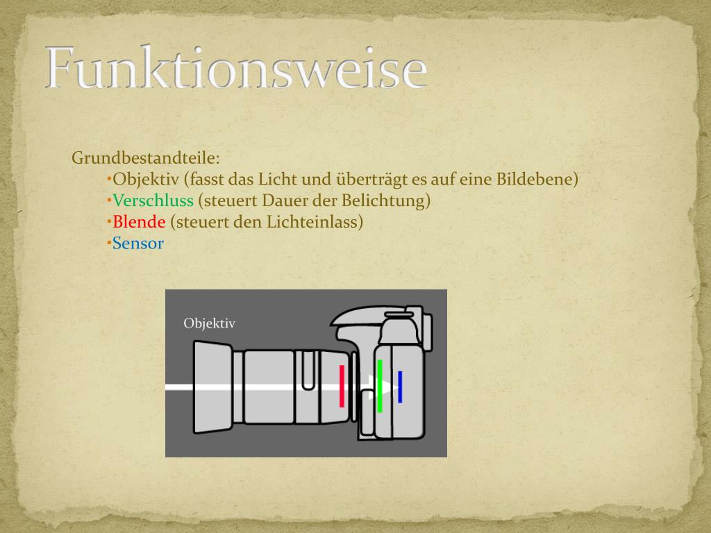 Funktionsweise • Grundbestandteile: • Objektiv (fasst das Licht und überträgt es auf eine Bildebene) • Verschluss (steuert Dauer der Belichtung) • Blende (steuert den Lichteinlass) • Sensor Objektiv