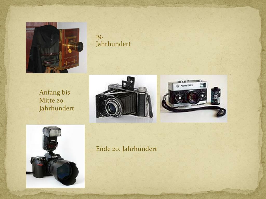 Entwicklung der Technik Namensgeber der ersten Kamera: CameraObscura Die ersten Kameras verfügten über ein Loch anstelle eines Objektivs und wurden aus Holz hergestellt. Die erste Ganzmetallkamera stellte Voigtländer vor. Wichtigste Entwicklung: Kleinbildkamera