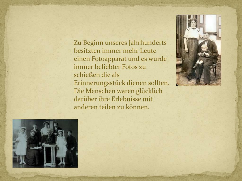 Zu Beginn unseres Jahrhunderts besitzten immer mehr Leute einen Fotoapparat und es wurde immer beliebter Fotos zu schießen die als Erinnerungsstück dienen sollten. Die Menschen waren glücklich darüber ihre Erlebnisse mit anderen teilen zu können.