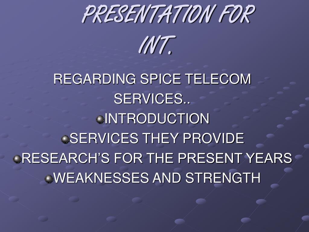 PRESENTATION FORINT. REGARDING SPICE TELECOM SERVICES.. INTRODUCTION SERVICES THEY PROVIDE RESEARCH’S FOR THE PRESENT YEARS WEAKNESSES AND STRENGTH
