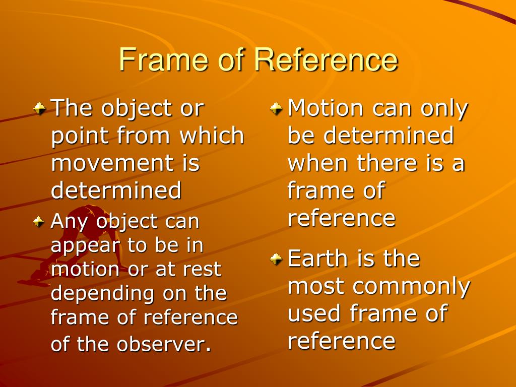 Frame of Reference • The object or point from which movement is determined • Any object can appear to be in motion or at rest depending on the frame of reference of the observer. • Motion can only be determined when there is a frame of reference • Earth is the most commonly used frame of reference