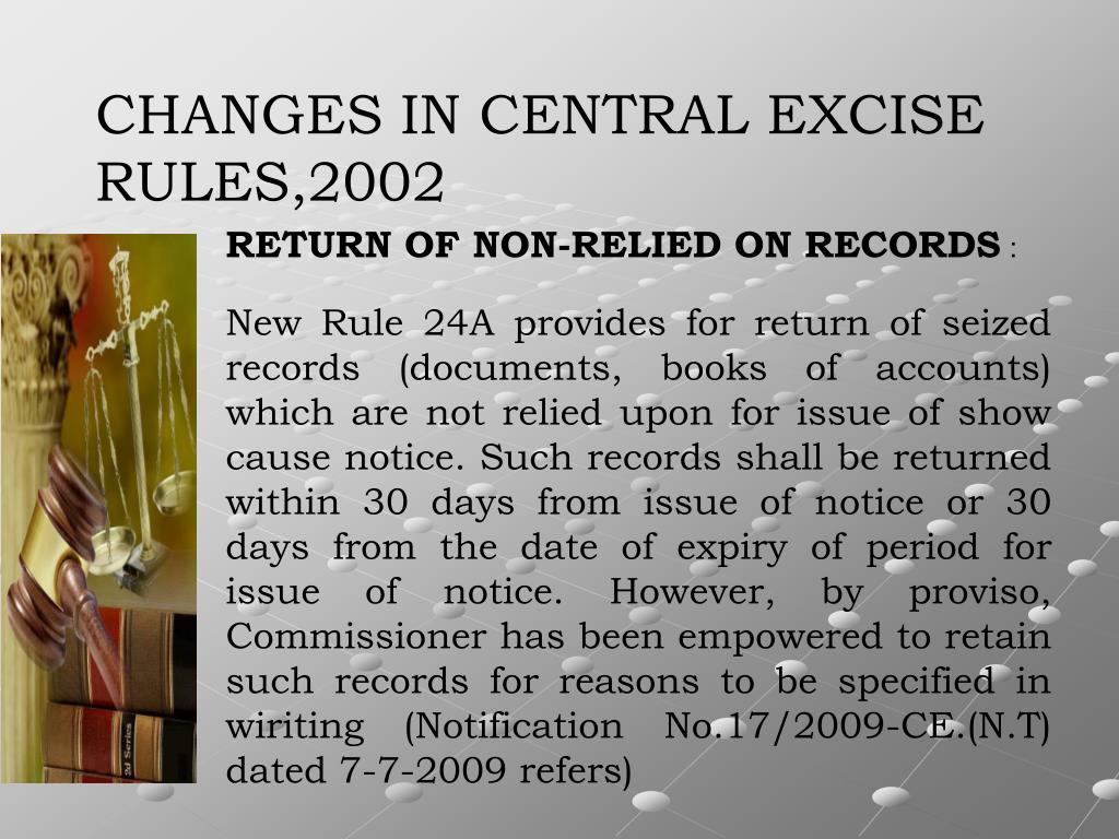 CHANGES IN CENTRAL EXCISE RULES,2002 RETURN OF NON-RELIED ON RECORDS : New Rule 24A provides for return of seized records (documents, books of accounts) which are not relied upon for issue of show cause notice. Such records shall be returned within 30 days from issue of notice or 30 days from the date of expiry of period for issue of notice. However, by proviso, Commissioner has been empowered to retain such records for reasons to be specified in wiriting (Notification No.17/2009-CE.(N.T) dated 7-7-2009 refers)