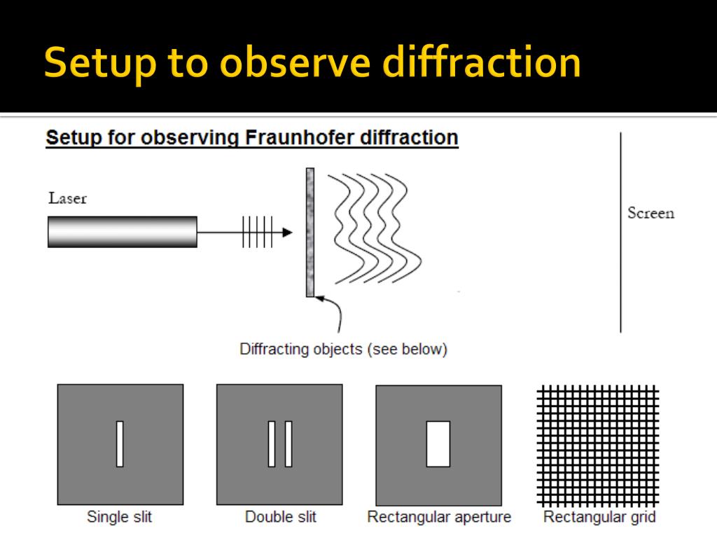 Topics to be discussed • Introduction • Diffraction theory • Fraunhofer diffraction integral • Experimental setup • Patterns from apertures • Single-slit • Double-slit • Rectangular aperture • Rectangular grid • Conclusions