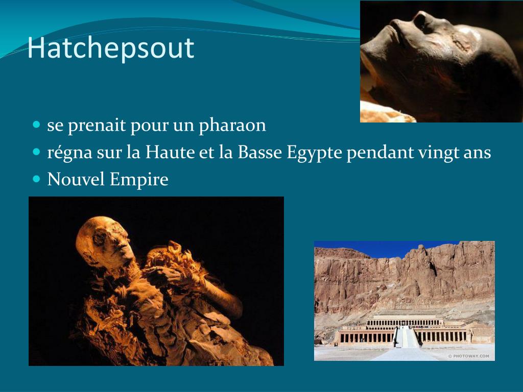 Hatchepsout • se prenait pour un pharaon • régna sur la Haute et la Basse Egypte pendant vingt ans • Nouvel Empire