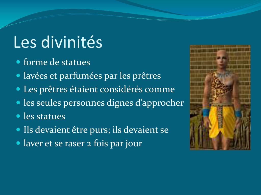 Les divinités • forme de statues • lavées et parfumées par les prêtres • Les prêtres étaient considérés comme • les seules personnes dignes d’approcher • les statues • Ils devaient être purs; ils devaient se • laver et se raser 2 fois par jour