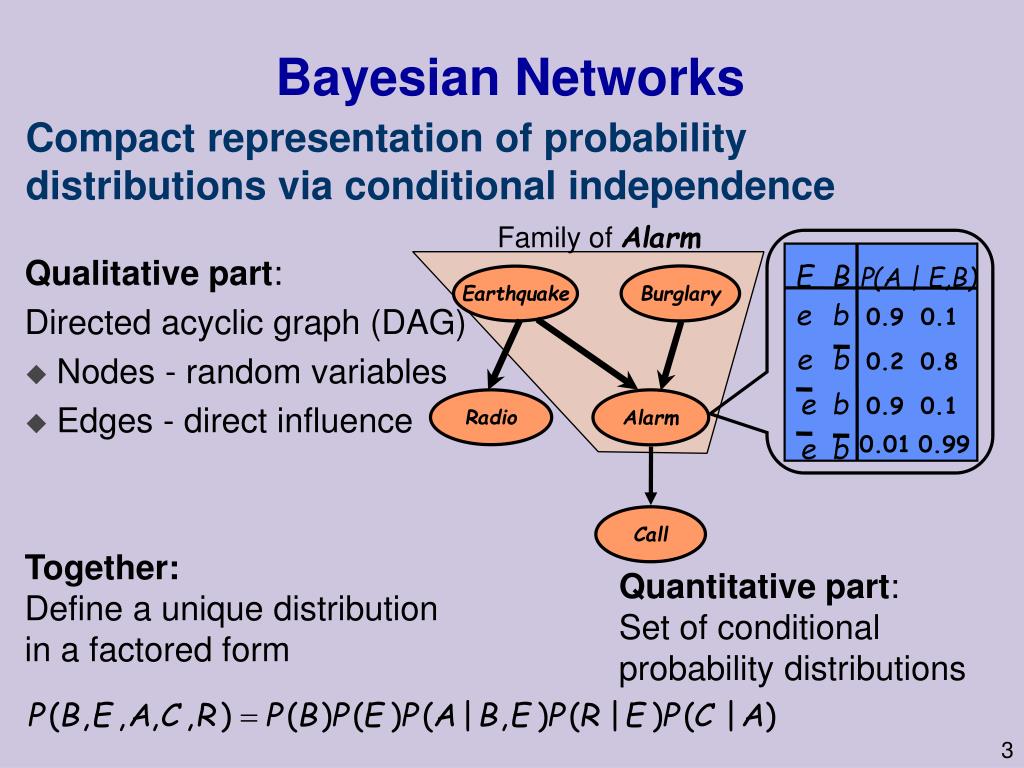 Qualitative part: Directed acyclic graph (DAG) Nodes - random variables Edges - direct influence Family of Alarm E B P(A | E,B) e b 0.9 0.1 e b 0.2 0.8 e b 0.9 0.1 0.01 0.99 e b Bayesian Networks Compact representation of probability distributions via conditional independence Burglary Earthquake Radio Alarm Call Together: Define a unique distribution in a factored form Quantitative part: Set of conditional probability distributions