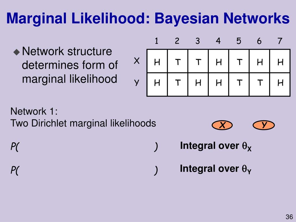 H H 1 T T 2 T T 3 H H 4 T T 5 H H 6 H H 7 H H T T H H H H T T T T H H Marginal Likelihood: Bayesian Networks • Network structure determines form ofmarginal likelihood X Y Network 1: Two Dirichlet marginal likelihoods P( ) P( ) X Y Integral over X Integral over Y