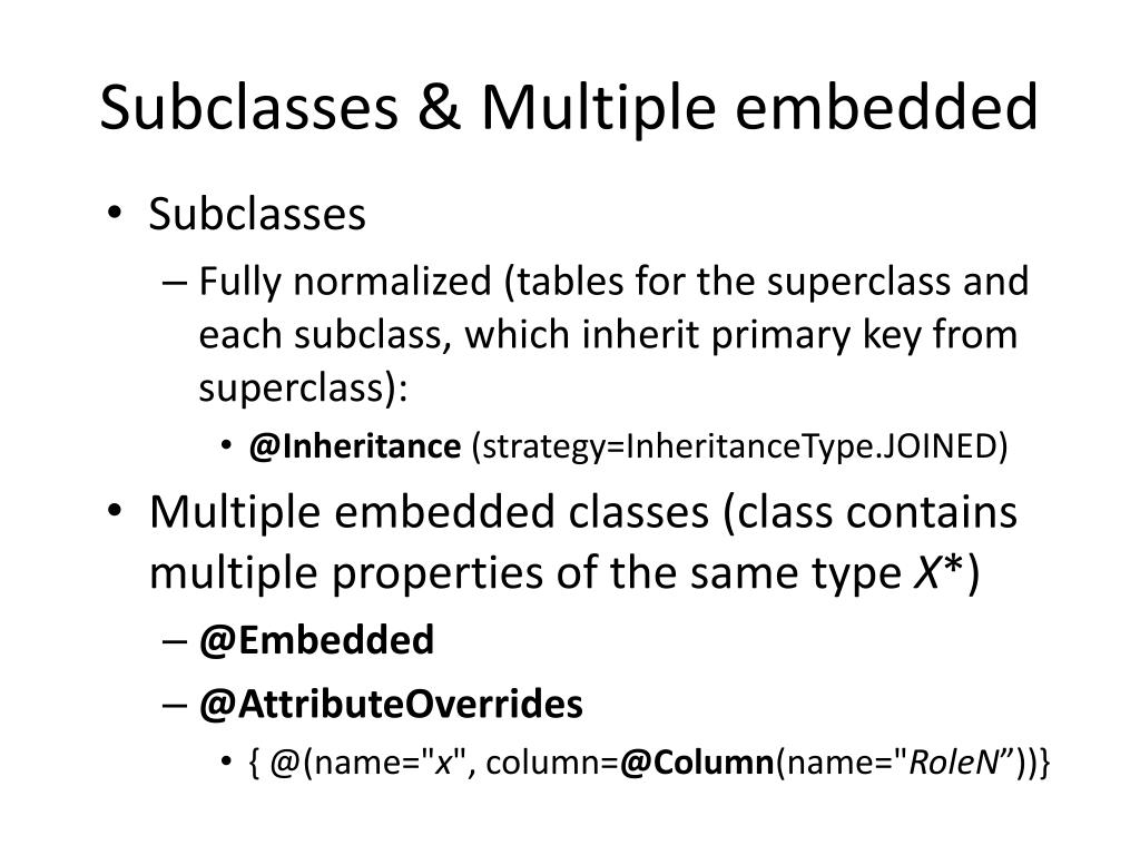 Subclasses & Multiple embedded • Subclasses • Fullynormalized (tables for thesuperclass and eachsubclass, whichinheritprimarykey from superclass): • @Inheritance (strategy=InheritanceType.JOINED) • Multiple embeddedclasses (classcontains multiple propertiesofthe same type X*) • @Embedded • @AttributeOverrides • { @(name="x", column=@Column(name="RoleN”))}