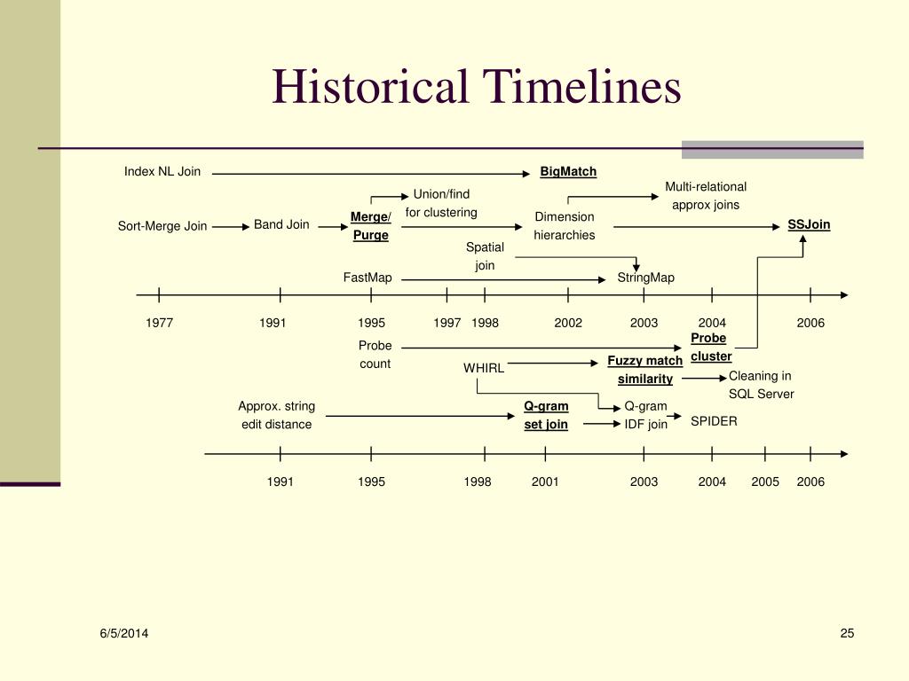 2006 2006 Historical Timelines Index NL Join Sort-Merge Join BigMatch Multi-relational approx joins Union/find for clustering Merge/ Purge Dimension hierarchies Band Join SSJoin Spatial join FastMap StringMap 1977 1991 1995 1997 1998 2002 2003 2004 Probe cluster Probe count Fuzzy match similarity WHIRL Cleaning in SQL Server Approx. string edit distance Q-gram set join Q-gram IDF join SPIDER 1991 1995 1998 2001 2003 2004 2005