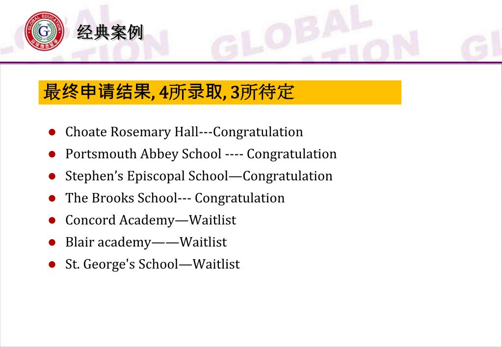 经典案例 • Choate Rosemary Hall---Congratulation • Portsmouth Abbey School ---- Congratulation • Stephen’s Episcopal School—Congratulation • The Brooks School--- Congratulation • Concord Academy—Waitlist • Blair academy——Waitlist • St. George's School—Waitlist 最终申请结果, 4所录取, 3所待定